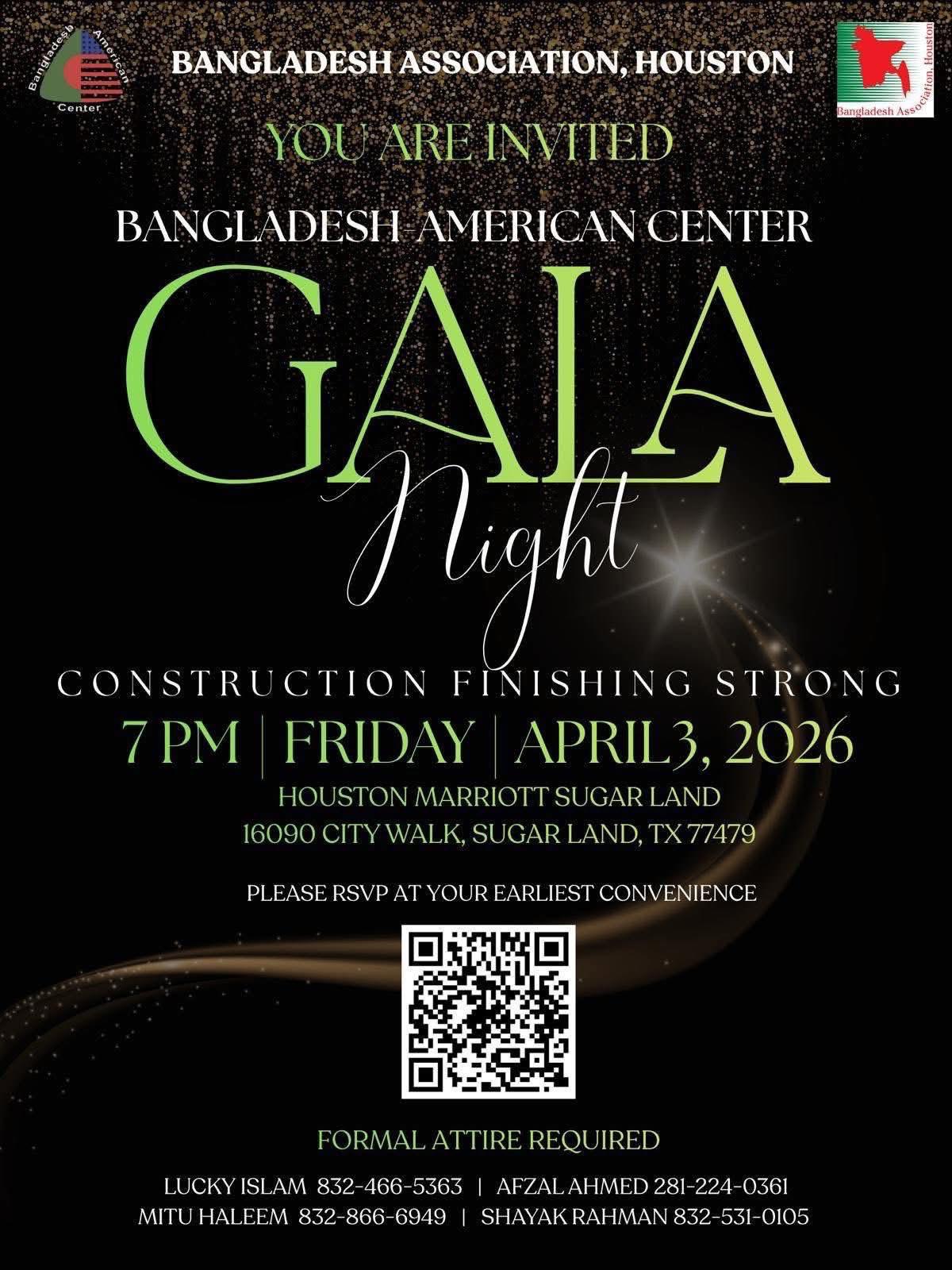On April 3, 2026, the Bangladesh Association of Houston proudly hosted a historic Gala, bringing together nearly 400 members of our community to celebrate and advance the Bangladesh American Center (BAC). We are deeply grateful to every dignitary, community leader, member, donor, and volunteer who made this evening truly unforgettable.